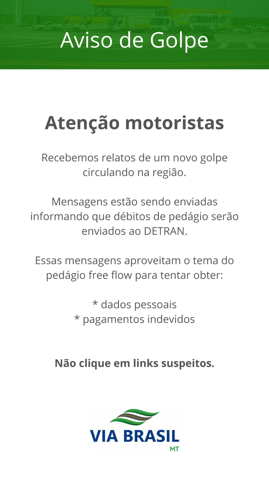 As pesquisas de opiniões realizadas nas rodovias que estão sob administração e gestão da Via Brasil MT têm refletido resultados que ratificam o acerto e o nosso compromisso com os usuários e o governo do estado, prestando serviços de atendimento pré-hospitalar, socorro mecânico, sinalização viária e inspeção de tráfego que resultam em qualidade no atendimento e segurança a todos os motoristas que trafegam diuturnamente por nossos trechos.